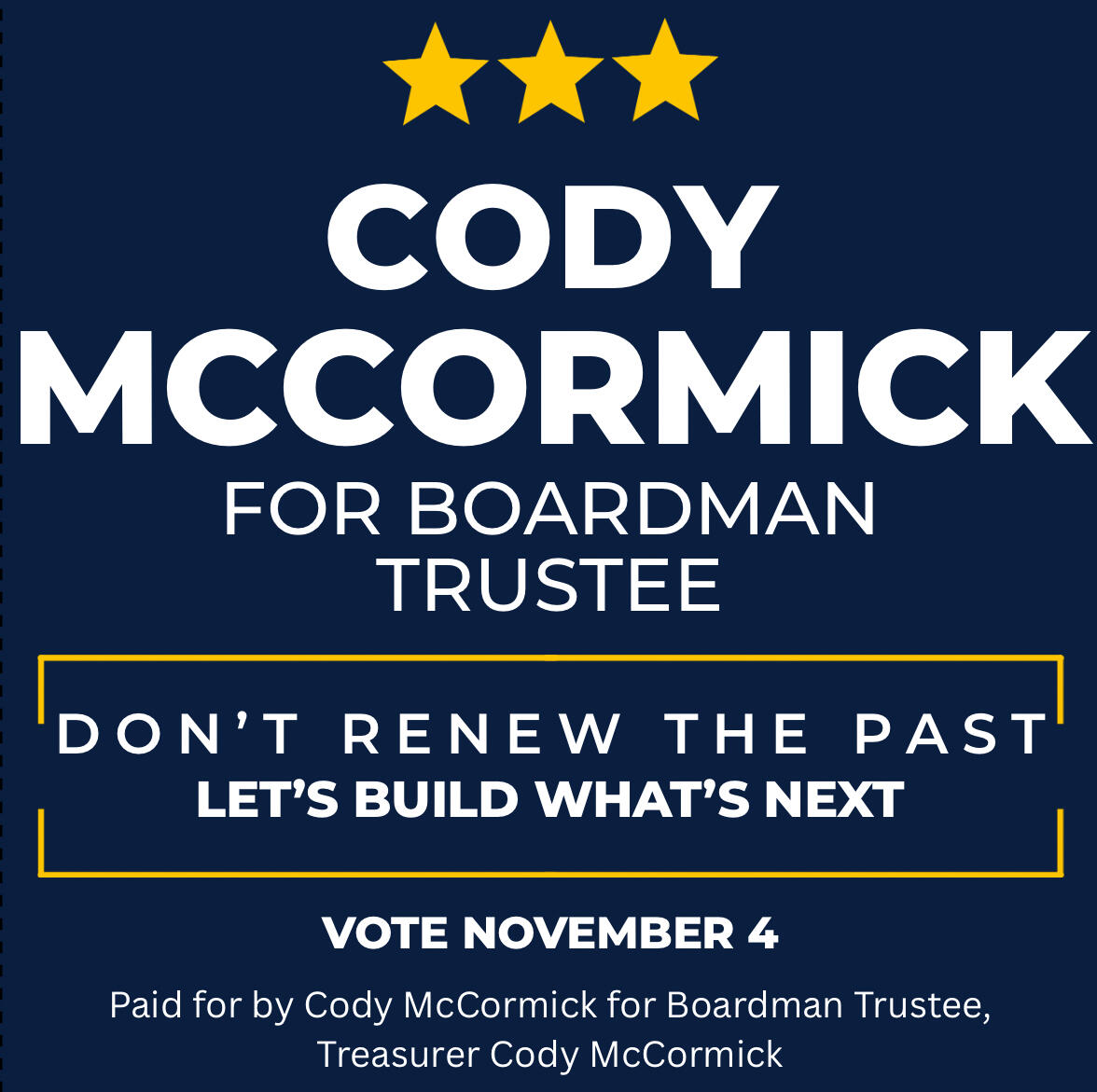 Cody McCormick for Boardman TrusteeTo request the mailing address, email: